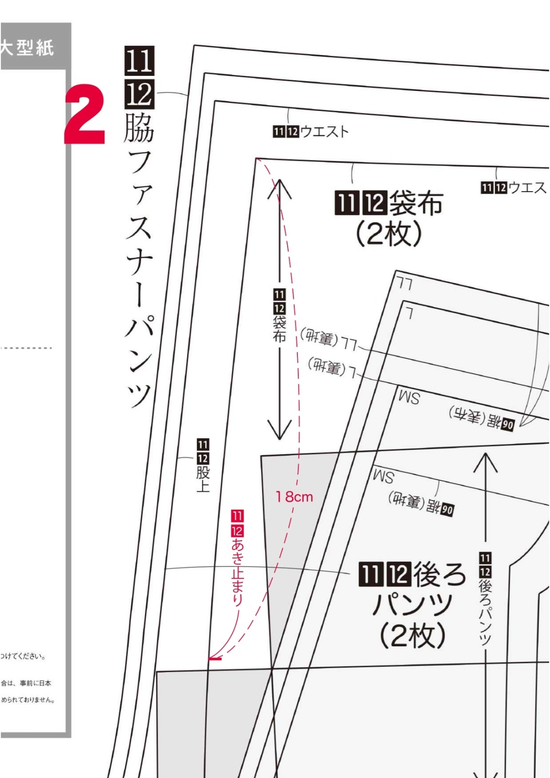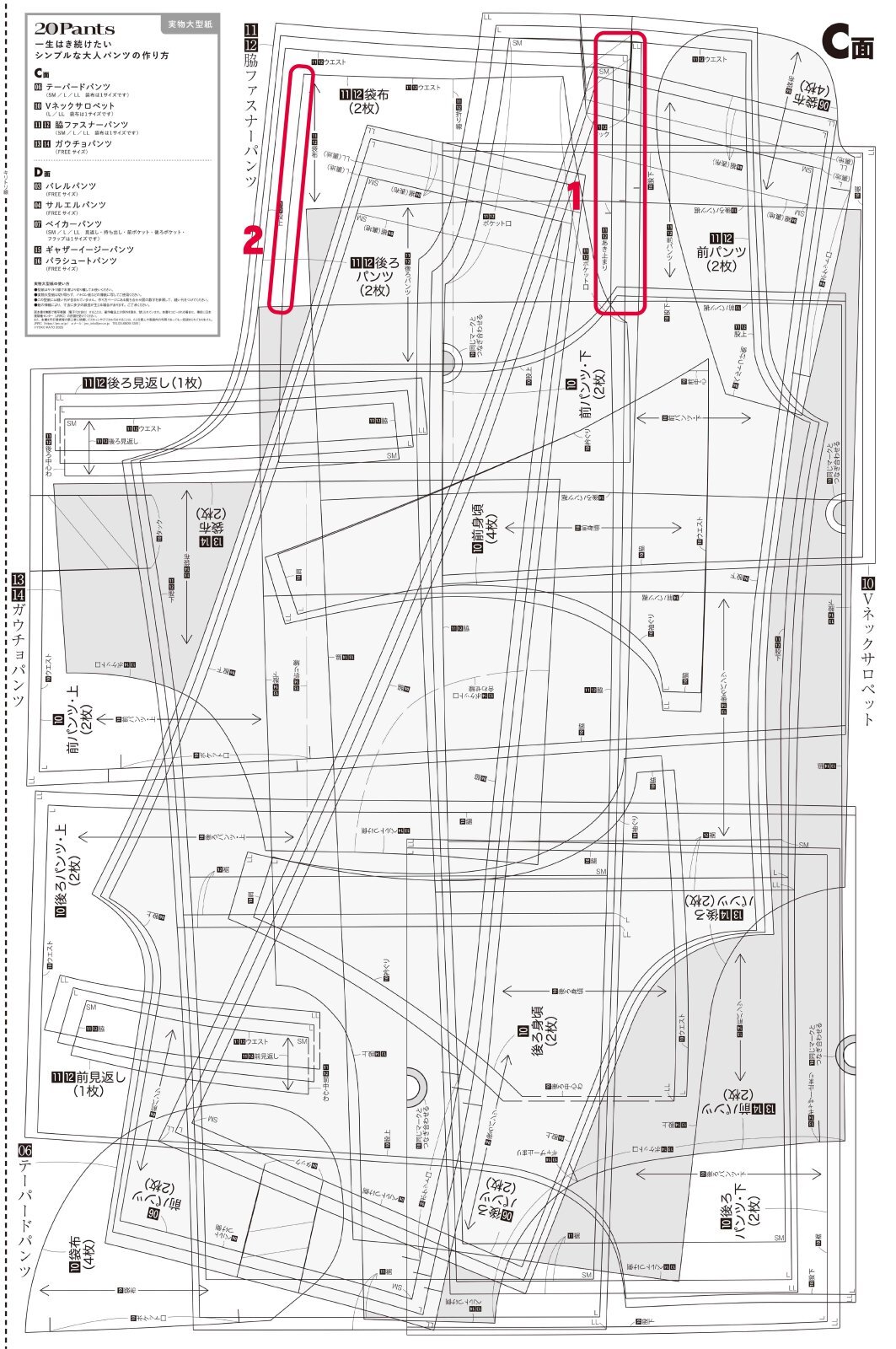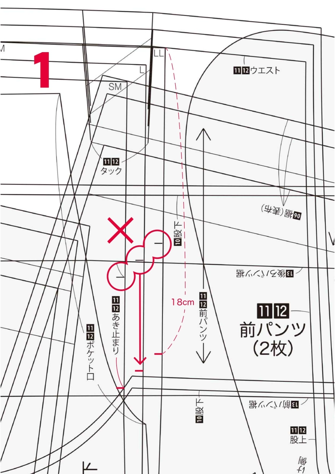 実物大型紙C面「11 12 脇ファスナーパンツ」の型紙の 「あき止まり」位置2か所に誤りがありました。 ご迷惑をおかけしまして、大変申し訳ありません。お詫びして訂正いたします。 ★誤りがあった2か所の位置